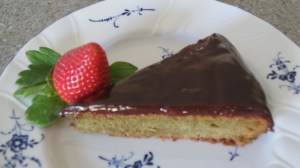Slowly mix in almond flour, baking powder then carefully blend in egg whites and pour into a greased torte pan and bake on 350° F Convection oven for 15 minutes. Cool, cover with preserves if you like and cover with dark chocolate.