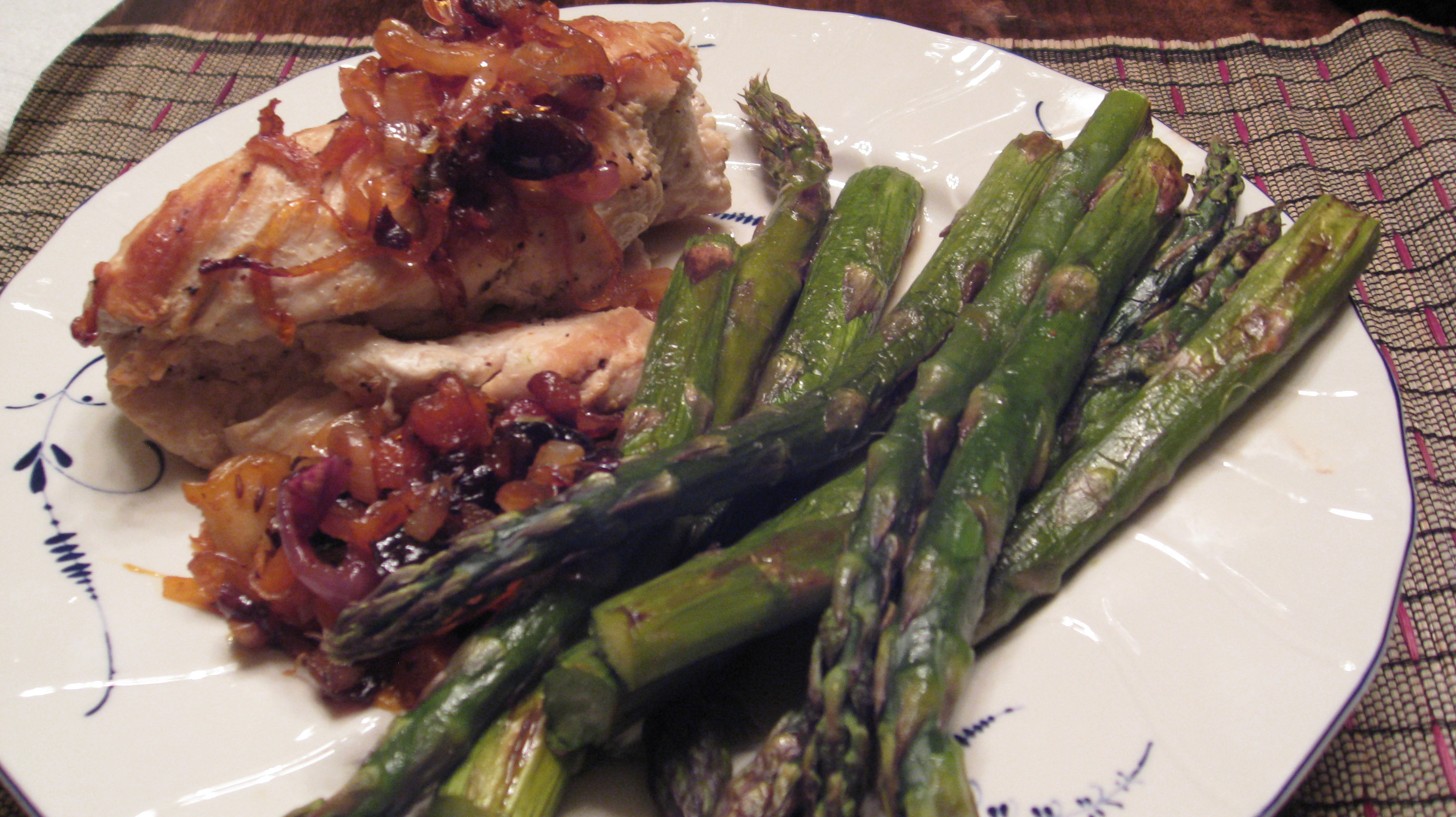 Top with my Dried Apricot and Prune Sautee and serve with some oven baked Asparagus!