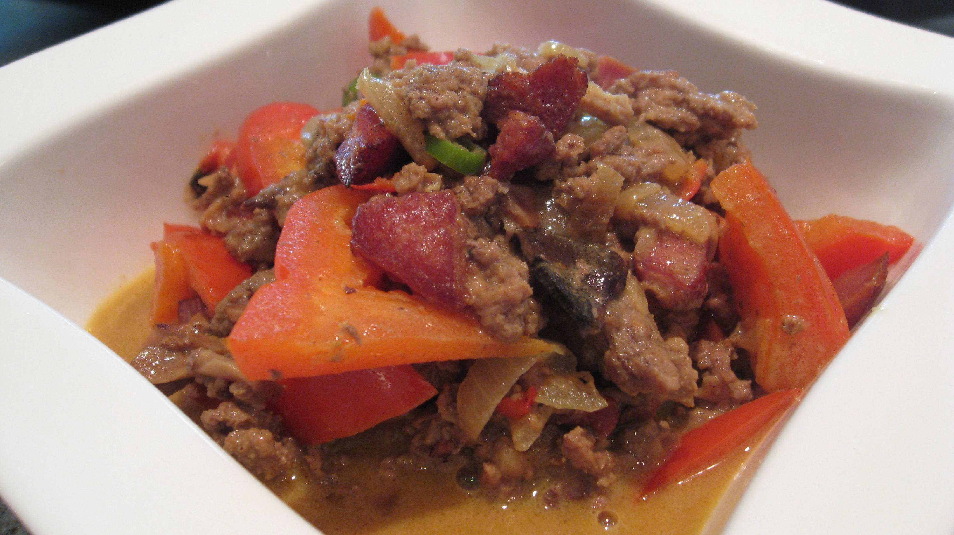 Add beef, sliced sausage, spices, garlic, and peppers (or other veggies) and cook for another 5-8 minutes on medium high heat. Next add mushrooms and cook until tender. Add the coconut milk and simmer (medium-low) for another 5-10 minutes.