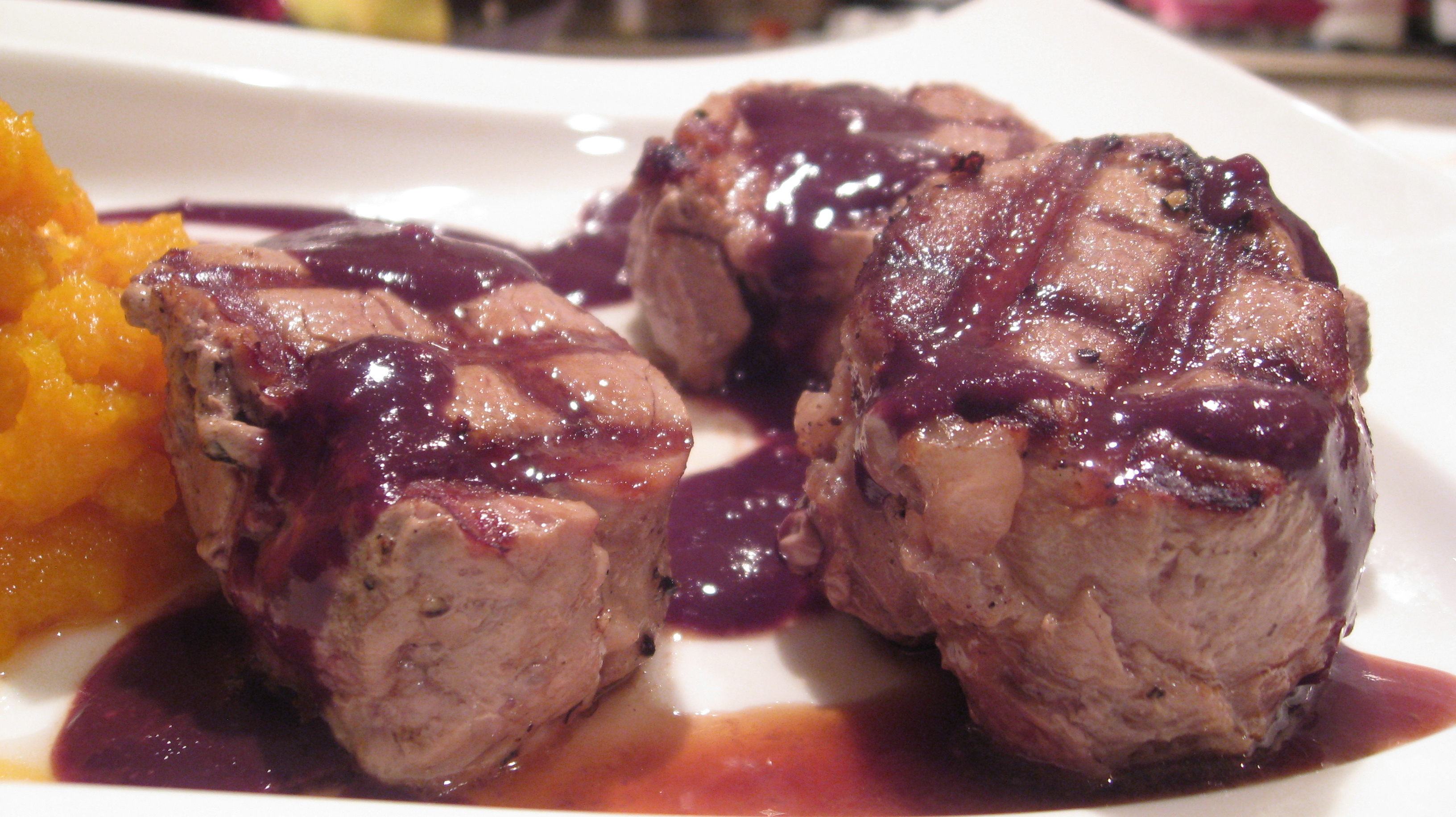 - Cut 1 1/2 pound pork loin (we get ours here) into 3/4 inch filets or to desired thickness – marinate in some sesame oil, pepper, and salt for a few hours