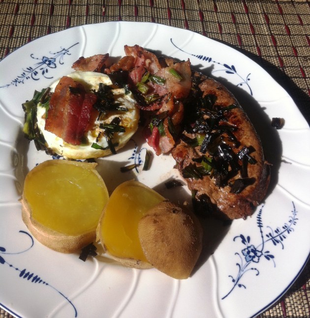This amazing breakfast consisted of one cage free egg a perfect strip of bacon, a few slices of boiled sweet potato and an deliciously prepared slice of fresh calf liver, roasted in a few green onions.