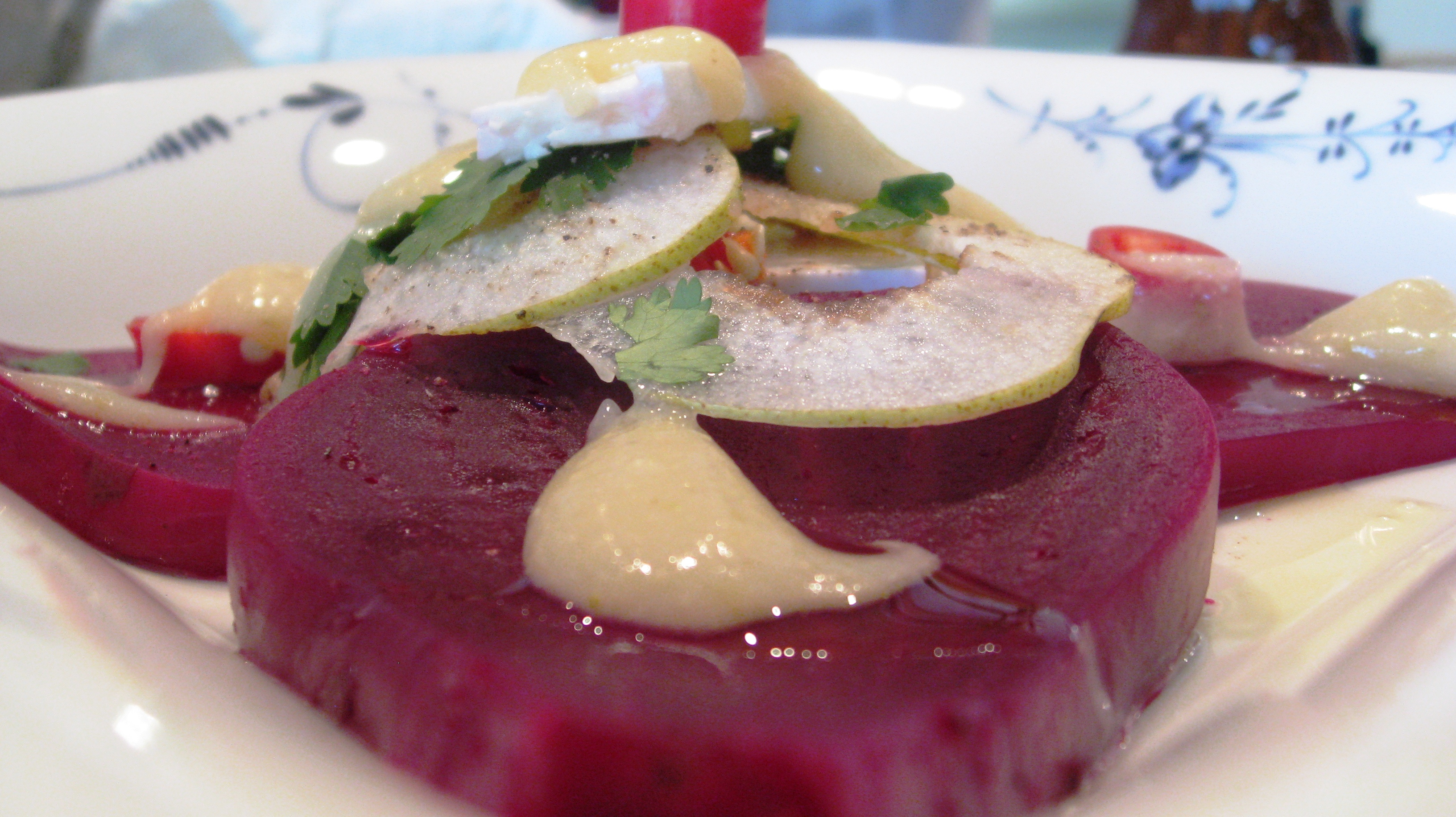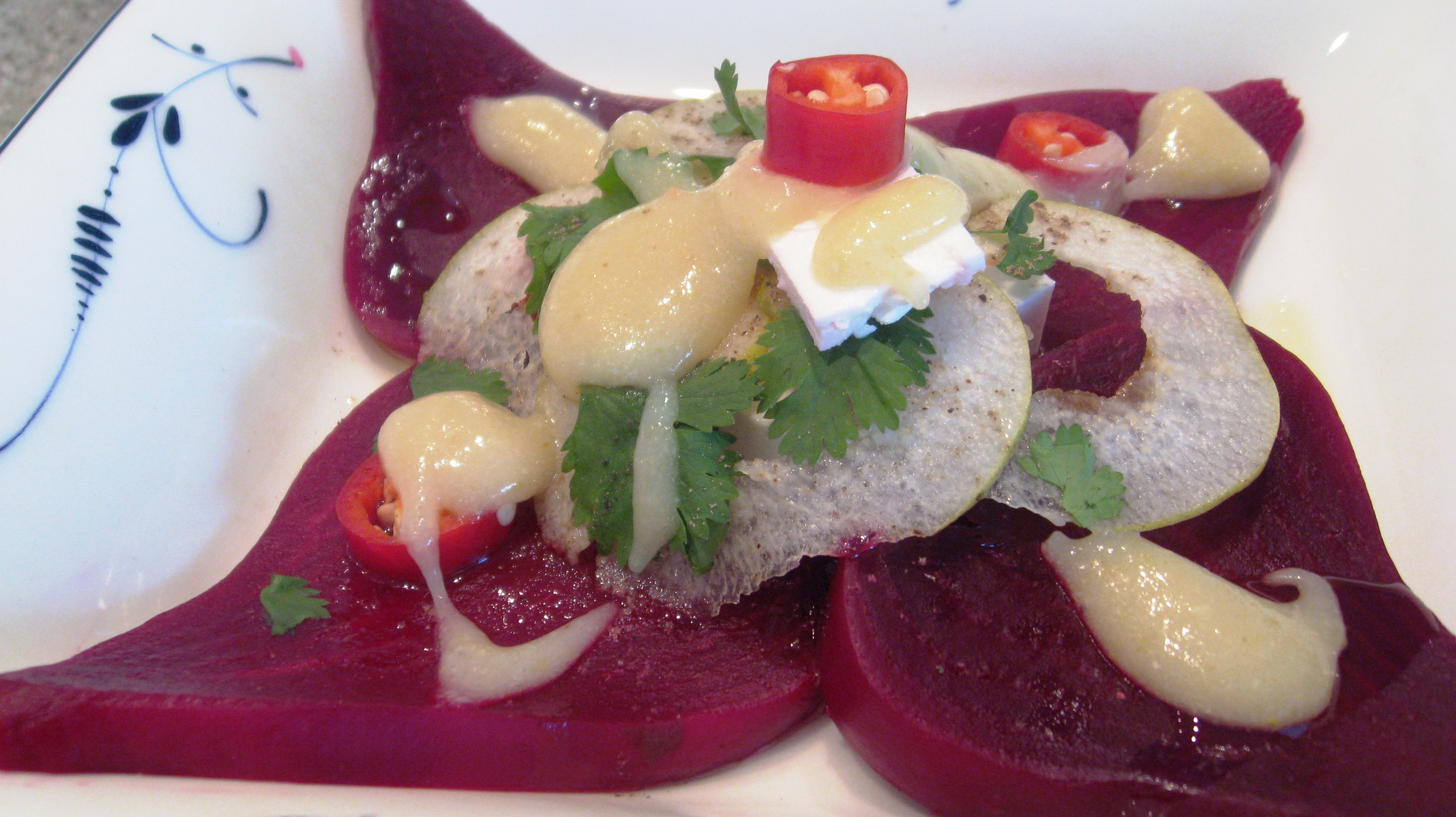 Slice the boiled beet in half and then equally cut slices and arrange with tip out on a pretty plate. The idea is to give it a Kaleidoscope or flowery look. Place one of the cheese squares into the center of the four beet slices. Drizzle with a little olive oil, sprinkle with salt, and add a few slices of chili pepper. Place shaved pear over the cheese and sprinkle with fresh cilantro leaves.
