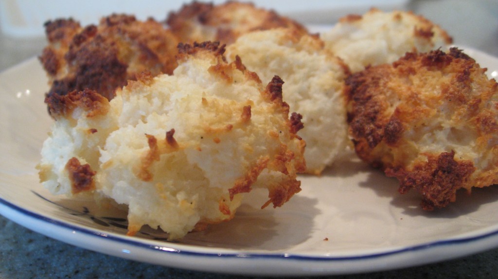 Pre-heat oven to 350. Whip egg whites until totally stiff. Mix together all other ingredients well, then very carefully fold them into egg whites. Scoop out with an ice cream scooper and place onto to parchment paper lined cookie sheets (you will need two). Bake on convection setting for 12 – 15 minutes or until golden brown.