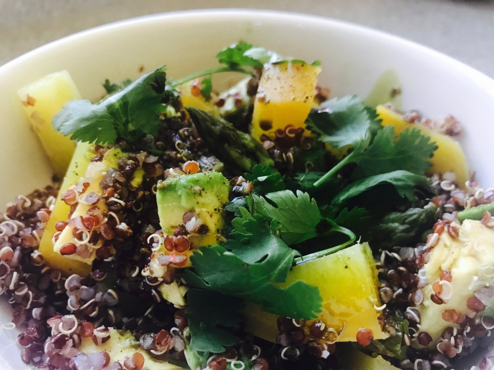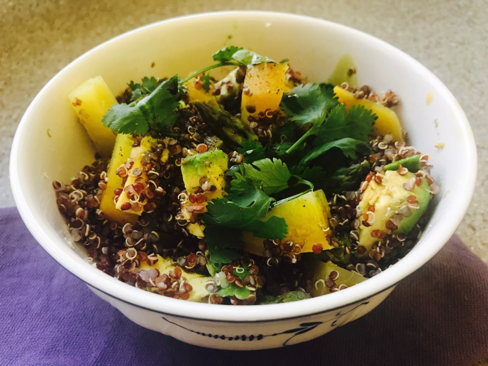 Let’s face it, eating leafy greens as your salad is wonderful, but it can get a bit monotonous. Eating a variety of fresh ingredients is absolutely key to a healthy lifestyle. We’d like to introduce you to another way to enjoy a tasty lunch or perhaps a lighter fare for dinner or a creative side dish. Summers are very hot here in our Sonoran Desert and it is important to eat foods that are light, cool, yet satisfying. In temperatures of 110 + degrees, we opt for more veggies and smaller portions to help cope with the heat. This particular dish features red quinoa, golden beets, avocado and asparagus, garnished with cilantro. Beets are high in folic acid, potassium, calcium and antioxidants. We love asparagus for a several reasons, it is an excellent source of vitamin K, folate, copper, selenium, vitamin B1, vitamin B2, vitamin C, and vitamin E., and asparagus a very good source of dietary fiber, manganese, phosphorus, vitamin B3, potassium, choline, vitamin A, zinc, iron, protein, vitamin B6, and pantothenic acid. Additionally so, it helps to get rid of excess body water and has anti-inflammatory properties. Use all organic if possible, especially beets.